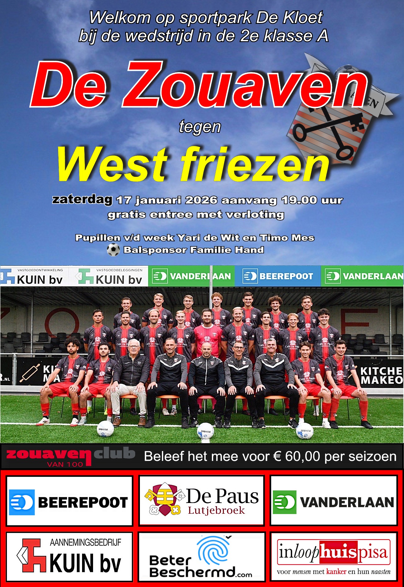 Kom allemaal onze Zouaven Heren 1 aanmoedigen! 💪⚽️ Ze spelen dit weekend een superbelangrijke wedstrijd en hebben jouw steun keihard nodig! Laat je horen langs de lijn, breng je vlaggen en trommels mee en help ons naar de overwinning! Samen staan we sterk! ❤️🩶 Tot dan! 🙌